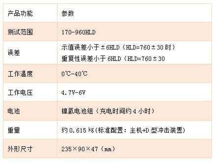 主机(含打印机)1台、D型冲击装置1支、小支撑环1只、尼龙刷1只、高值标准里氏硬度块(HLD值)1块、充电器1只, 手提箱。